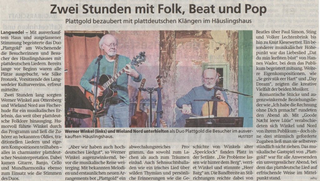 Seit eineinhalb Jahren ist „Plattgold“ als Duo unterwegs und kann zunehmenden Erfolg auf den verschiedensten Bühnen verzeichnen. „Wir singen und spielen auch vor Publikum, denen Plattdeutsch nicht so geläufig ist, deshalb moderiere ich die Veranstaltungen stets auf Hochdeutsch. Sehr oft verändern die Textinhalte sich in der neuen Form und daher bedarf es schon der einen oder anderen Erklärung. Dazu kommt, dass manche Lieder sehr schnell gespielt werden, um einen bestimmten Rhythmus zu erzielen, und uns ist es wichtig, dass man versteht, worum es sich dreht, nicht nur, dass man eine schöne Melodie hört, nach der man sogar tanzen könnte“, erklärte Winkel, der Plattdeutsch quasi schon von Kindesbeinen an her spricht.